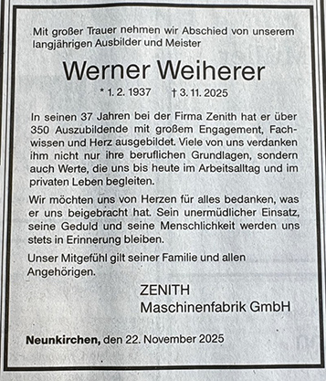 Der in Ingolstadt geborene Werner Weiherer war den größten Teil seines Arbeitslebens als Ausbilder und Lehrlingsmeister bei Zenith am Standort in Neunkirchen tätig und hat großen Anteil an der erfolgreichen Lehre von über 350 jungen Menschen. In der hauseigenen Lehrwerkstatt wurden zahlreiche Bauschlosser und Konstruktionsmechaniker ausgebildet.